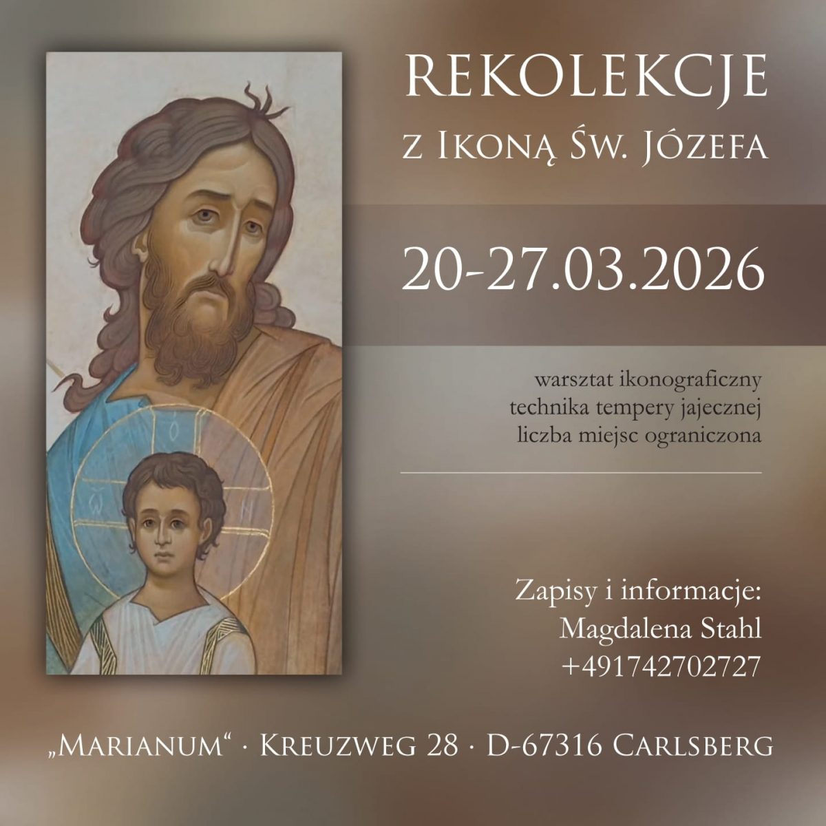 Zapraszamy serdecznie w dniach 20-27.03.2026 na rekolekcje i warsztaty z ikoną św. Józefa w Marianum. Zapisy : Magdalena Stahl, +49 174 27 0 27 27